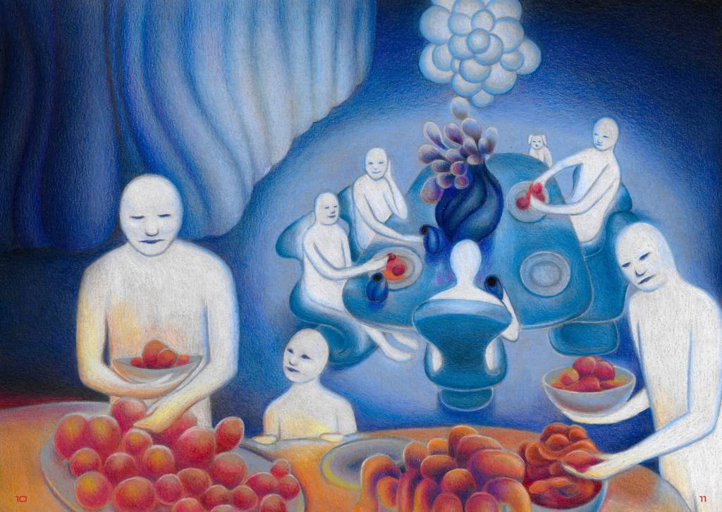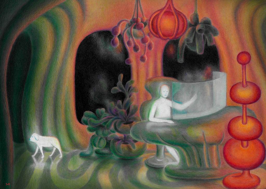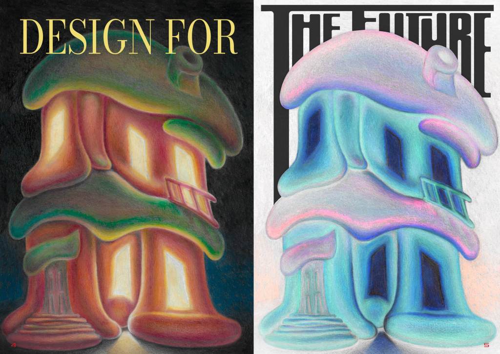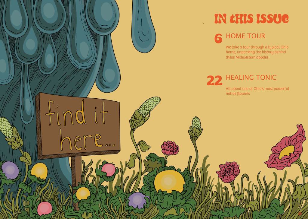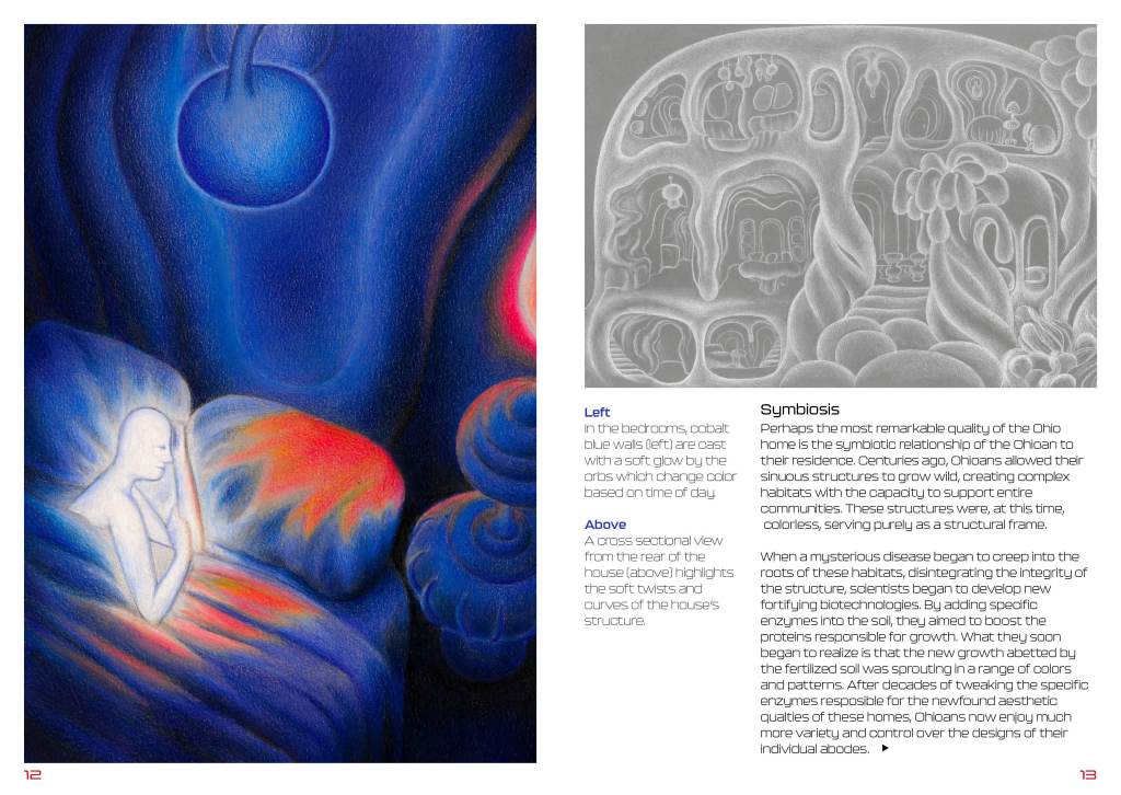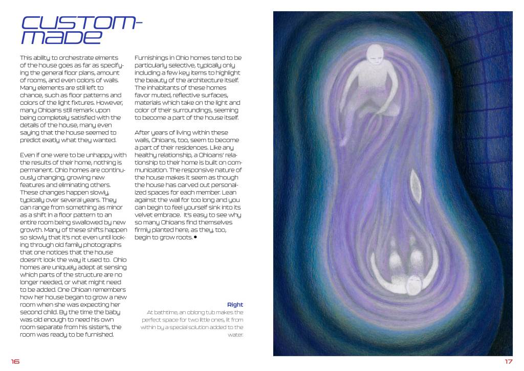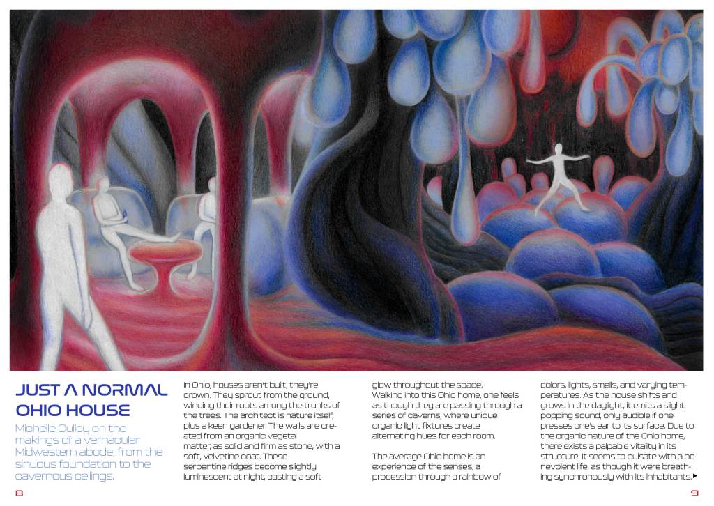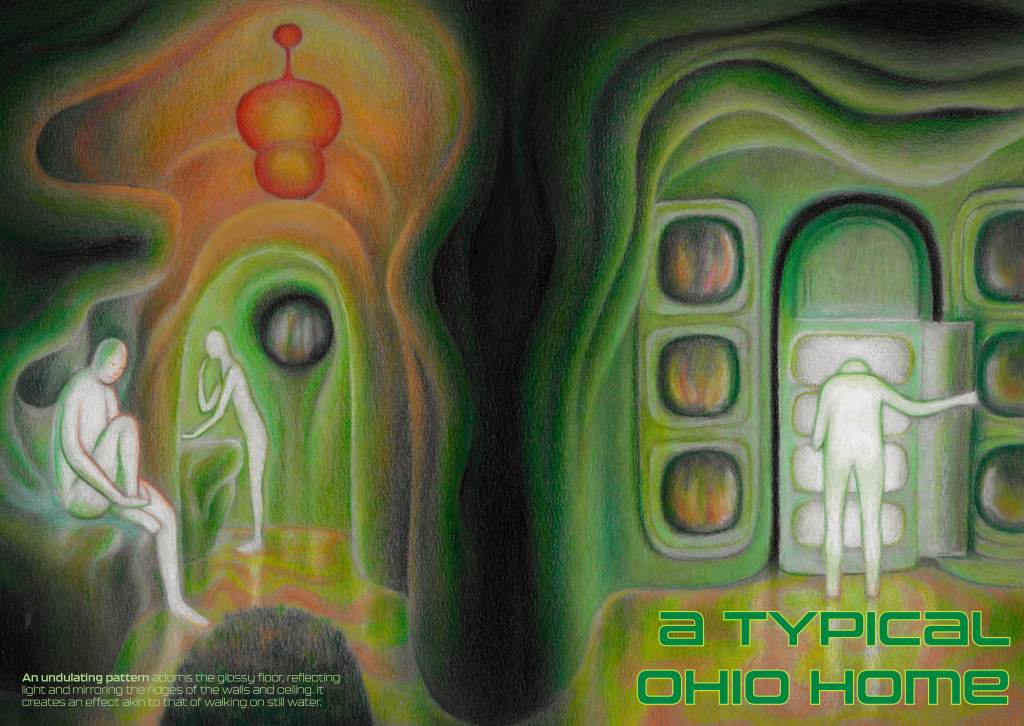 “Midwest Perspective” is a speculative 28 page zine reimagining my childhood home in Ohio as an alien world. It takes the reader on a tour through a “typical Ohio home” and shows colorful, hand-drawn illustrations of dreamlike scenes from this strange world. It examines the distorting effects that nostalgia has on physical space, and questions the notion of an ideal American home.