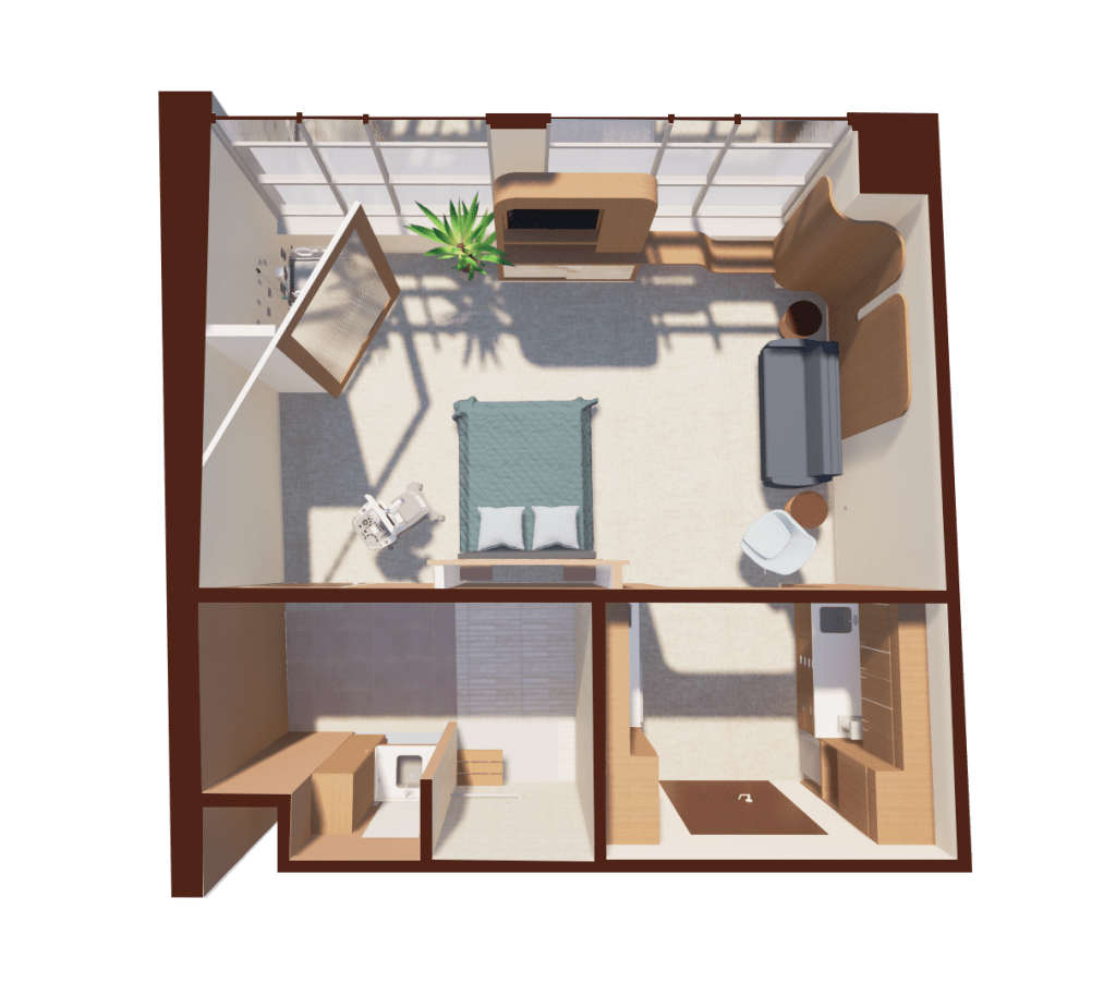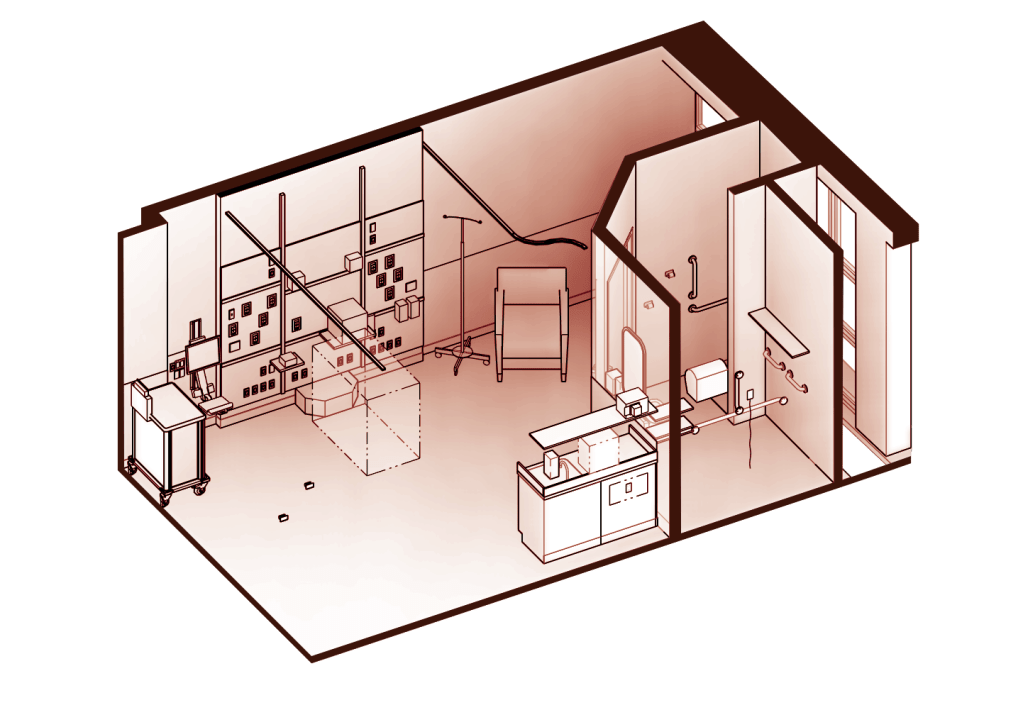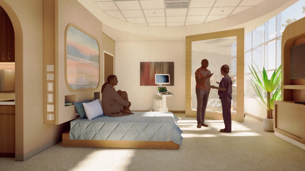 The low intervention birthing center was a part of the project that transformed existing conference rooms into three low intervention birthing suites with a reception desk and support space. These suites were designed to be a place for people who wanted to give birth in a less sterile, medical setting, with midwives or doulas, but with the peace of mind knowing that medical support is close by. It was designed to be a warm, serene environment, utilizing natural materials, warm colors, and indirect lighting, which would elevate it from a typical hospital experience. However, since there are certain pieces of medical equipment and elements which were required to be in this space, the challenge was incorporating these in a way which would make them less noticeable, and therefore less intimidating.