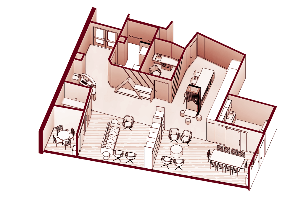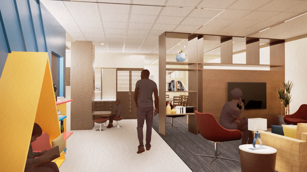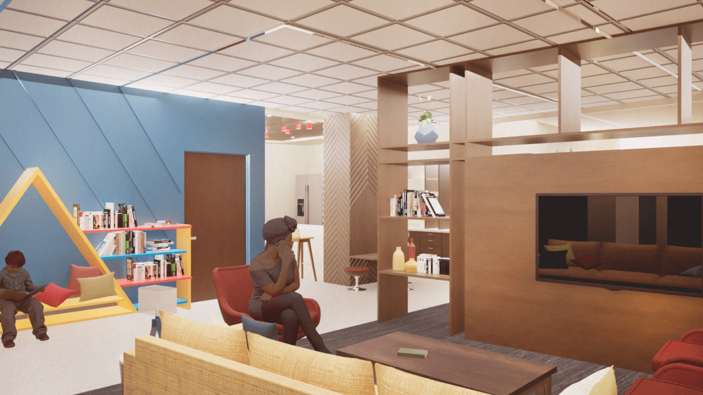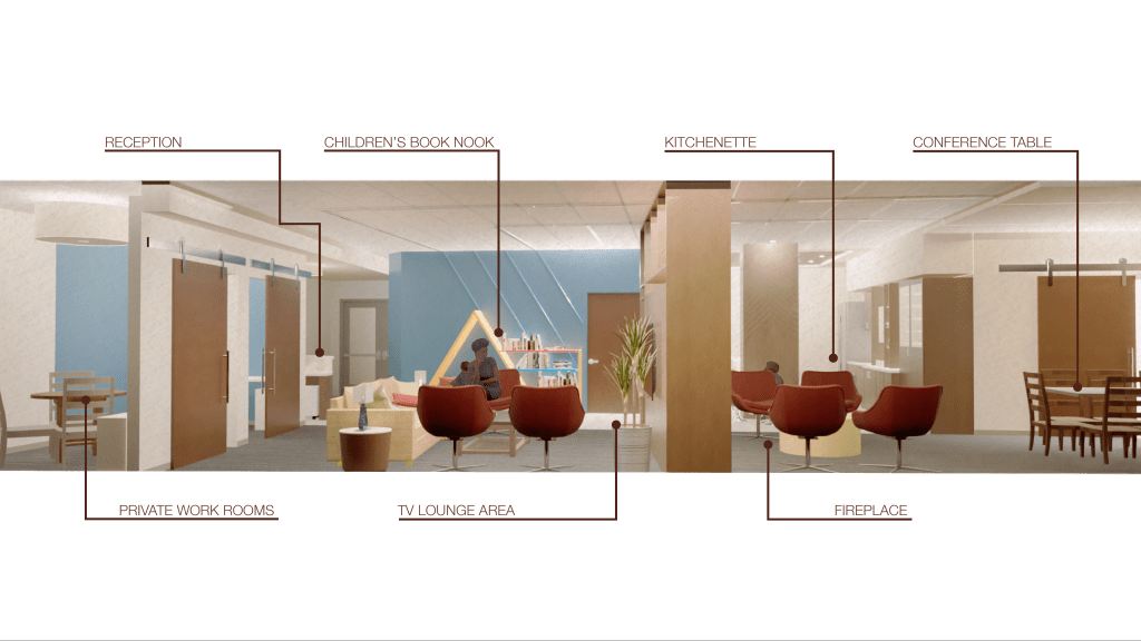The Ronald McDonald House lounge was a design for a space within the hospital that would be for the use of families with children in the NICU. It included a full kitchen, a shower room, a laundry room, private work rooms, and a lounge area. Custom casework elements were a primary characteristic of this space with one main casework element including a TV on one side and a fireplace on the other. The design utilized the Ronald McDonald house signature primary colors, adding playful accents throughout the space.